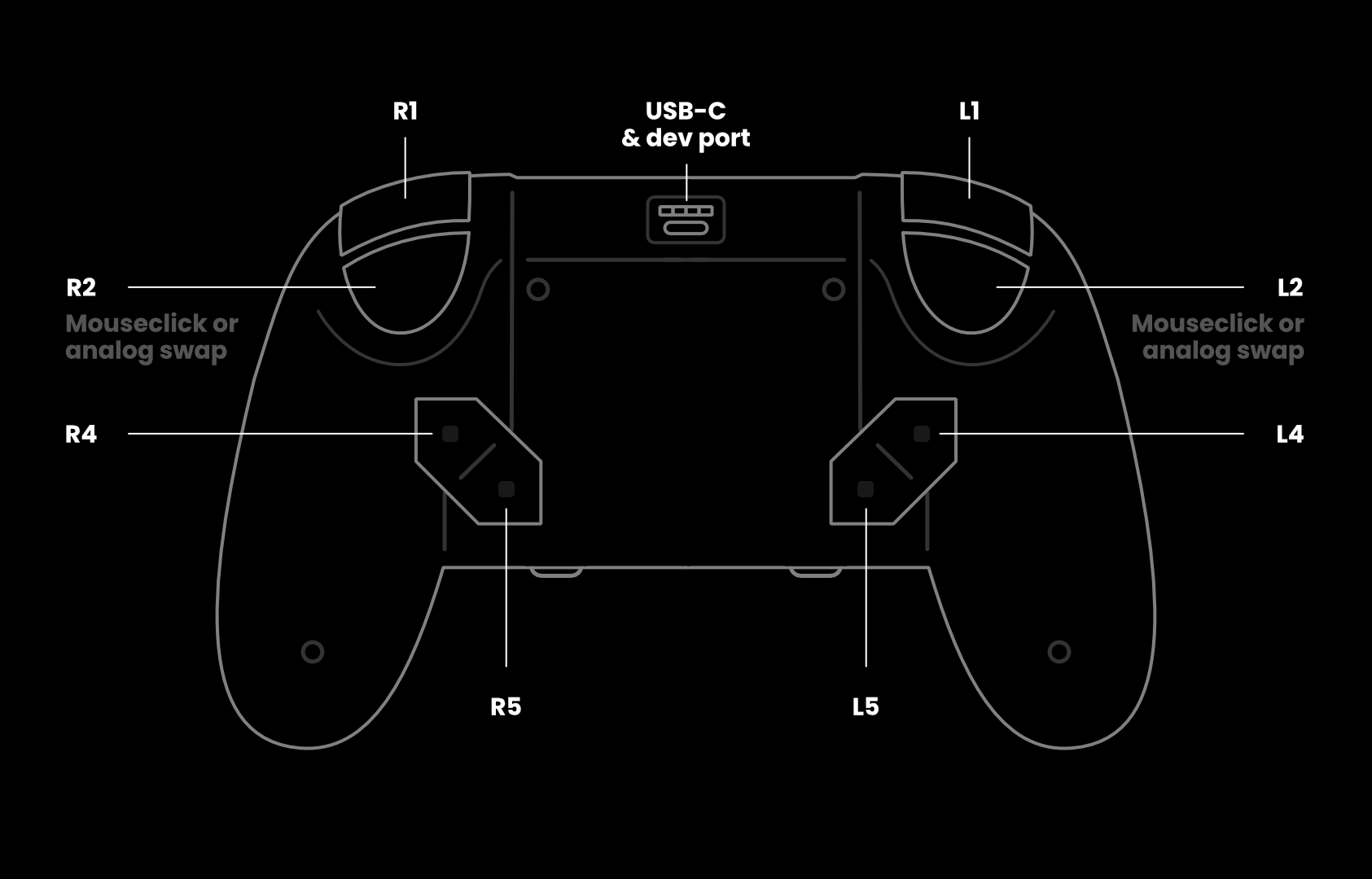 - 2 Swappable triggers (mouse-like click or analog).